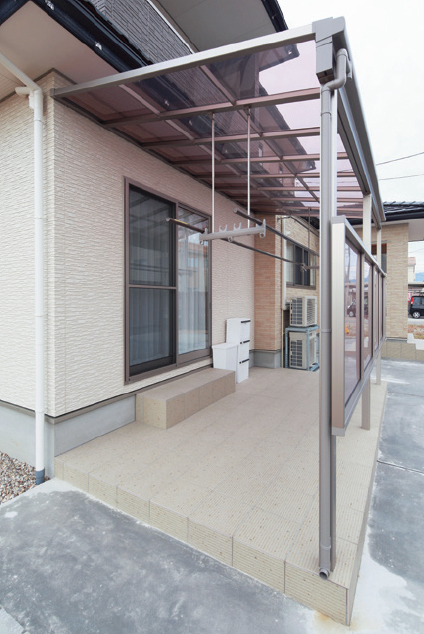 1 階テラスはたっぷり洗濯物を干せるスペースを確保。キッチンからお子様が遊んでいるときでも目が届く。